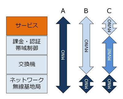 そこでMVNOに対して、携帯キャリアとの交渉や、帯域制御や課金・認証などの機能を提供する事業者が現れた。MVNOを可能にするもの(イネーブラー)という意味でMVNEと呼ばれる。格安のSIMを提供するMVNOの多くは、このMVNEを利用したパターン(C)が多い。BのパターンのMVNOが、同時にMVNEを営む場合もある。