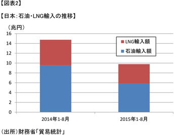 この好調な企業収益の背景として、特に今年は原油安要因も大きい。今年1-8月の石油・LNG輸入を昨年同期と比べると、数量は大して減少していないのに金額は約5兆円も減少しており、その分国内の購買力が増え、企業収益に寄与する計算となる(図表2)。