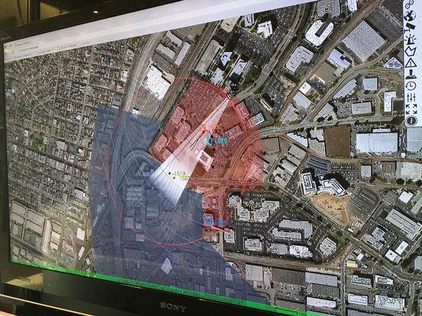 探知したドローンを地図上に表示するシステム。警戒区域を設定することもできる(下写真)。