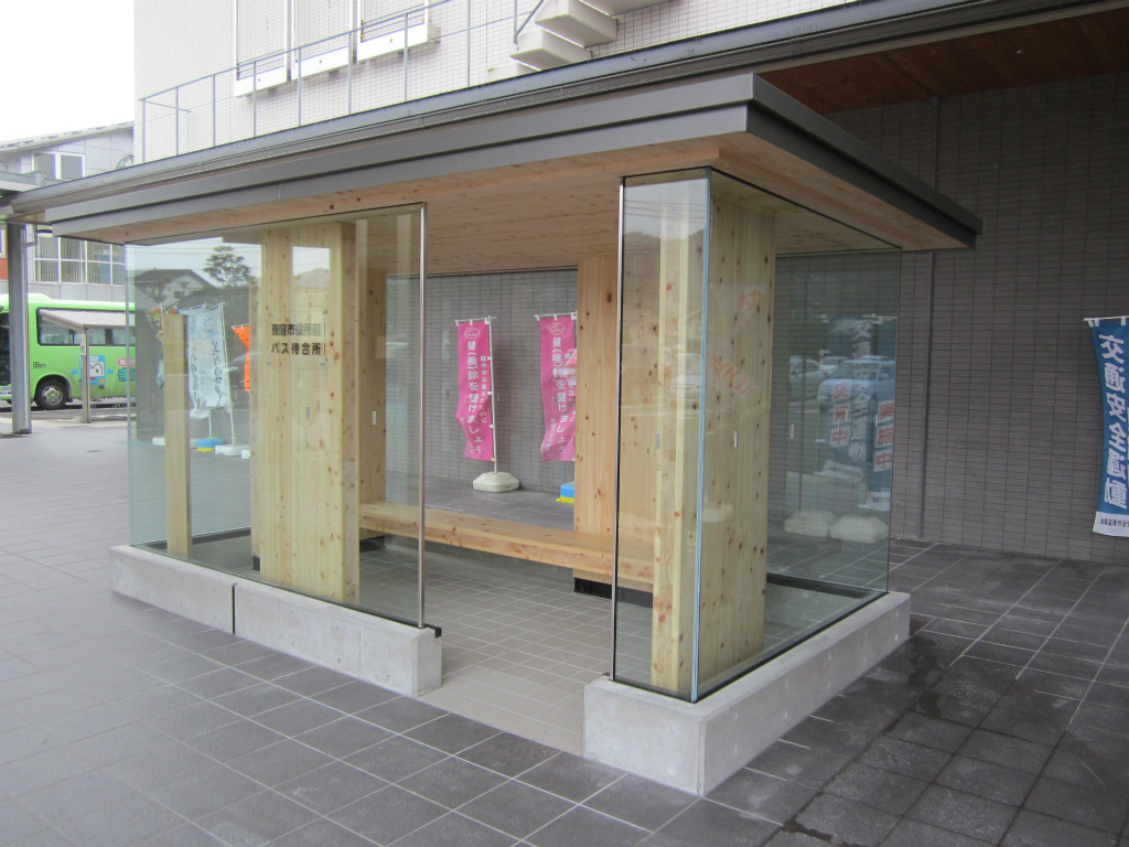 真庭市役所前のCLTで作られたバス停留所(日本CLT協会提供)
