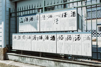 雑誌『酒』の編集長を務めた佐々木久子さんのメッセージと、『酒』の扉を飾り、酒をこよなく愛した作家・詩人・政財界人による「酒」の文字や散文がパネルに。賀茂鶴の塀にかかる