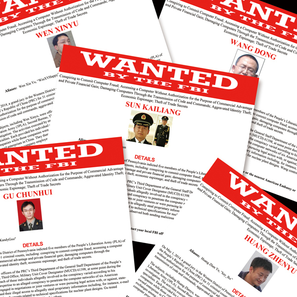 FBIは現役の人民解放軍軍人5人を指名手配し、ホームページに公開している(FBI)
