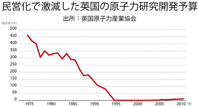 自国設計の原発から加圧水型軽水炉型の導入に切り替えた英国BNFLは、99年に技術を持つウエスティングハウスを買収する。しかし、北海の石油・ガス生産量が輸出をするほどに増え、02年に政府は原発の新設見送りを決める。ウエスティングハウスは東芝に売却され、英国は原子力技術を失った。