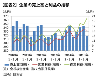 日本経済を取り巻く良好な経済環境と成長率のちぐはぐさを示す一つは、円安などで企業業績が絶好調(図表2)でありながら賃金上昇が乏しいことである。相対的に低賃金の非正規雇用者がもっぱら増加していることが平均賃金上昇の鈍さにつながっていることはあるが、それでも賃金はもっと上がってしかるべきである。