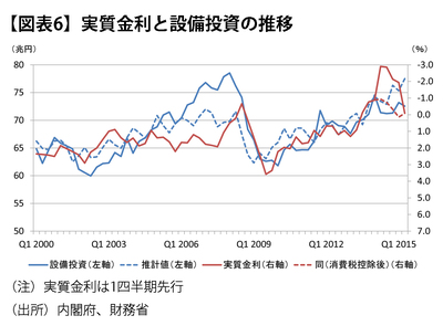 さらに、従来にない金融緩和にもかかわらず、設備投資の盛り上がりも欠けている。従来と同じような金利と設備投資の相関から言えば現状より5%以上設備投資が増える局面にあるが(図表6)、内外需要の低迷や先行きの不透明感の高まりなどで設備投資を手控える動きも強まっている。