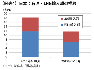また原油安では、今年1-10月の石油・LNG輸入額は昨年同期比GDPの1%以上に当たる6.5兆円近く減少しているのに、経済への好影響が十分には見えない点もある(図表4)。この輸入額減少分は企業と家計にプラスとなっているが、家計の貯蓄率が上がるなど吸収されたままの分が多いように見える。