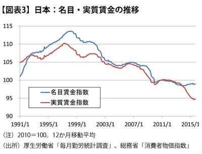 その平均賃金は、名目・実質ともに98年以降の下落の一途とも言える状況から完全には脱していない。むしろ、実質賃金は消費税引き上げ後の物価上昇の高まりの中でさらに下落している。名目・実質賃金とも直近ではようやく回復に転じたが、それでも毎月の賃金変動のぶれを均した12か月移動平均の数値で見ると底入れした程度である(図表3)。