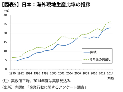 大幅な円安にもかかわらず、製造業の海外現地生産比率上昇も止まっていない(図表5)。海外現地生産比率は、過去3年の円安進展でも一層高まっており、今後5年ではさらに高まる方向にある。為替変動などを避けて地産地消を志向する傾向は強まっており、リーマンショック前と比べると、多くの業種で国内生産は回復していない。
