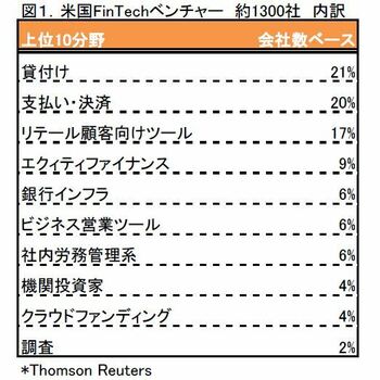 2014年の世界FinTechベンチャー投資は約120億米ドル(前年比約4倍)となり、その約8割が米国だ。図1は米国FinTechベンチャー企業(約1300社)のサービス分野別内訳となっている(会社数ベース)。