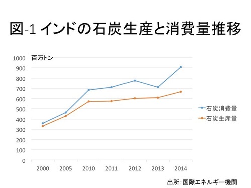 英国は2025年石炭火力全廃の方針をCOP21の前に明らかにしたが、ドイツ環境相もCOP後に2050年石炭火力全廃と述べている。中国、米国、欧州と石炭離れが進んでいるが、本当に石炭の黄金時代は終わったのだろうか。12億2000万の人口のうち2億4000万人の電力供給がない人を抱え、電力不足に悩むインドでは、図-1が示すように、石炭生産量と消費増は増加を続けている。今後も電力需要量は大きく増えるが、インドの気候変動対策は効率目標だから、CO2の絶対量の削減には当分踏み切ることはなく、石炭消費量も増加する。