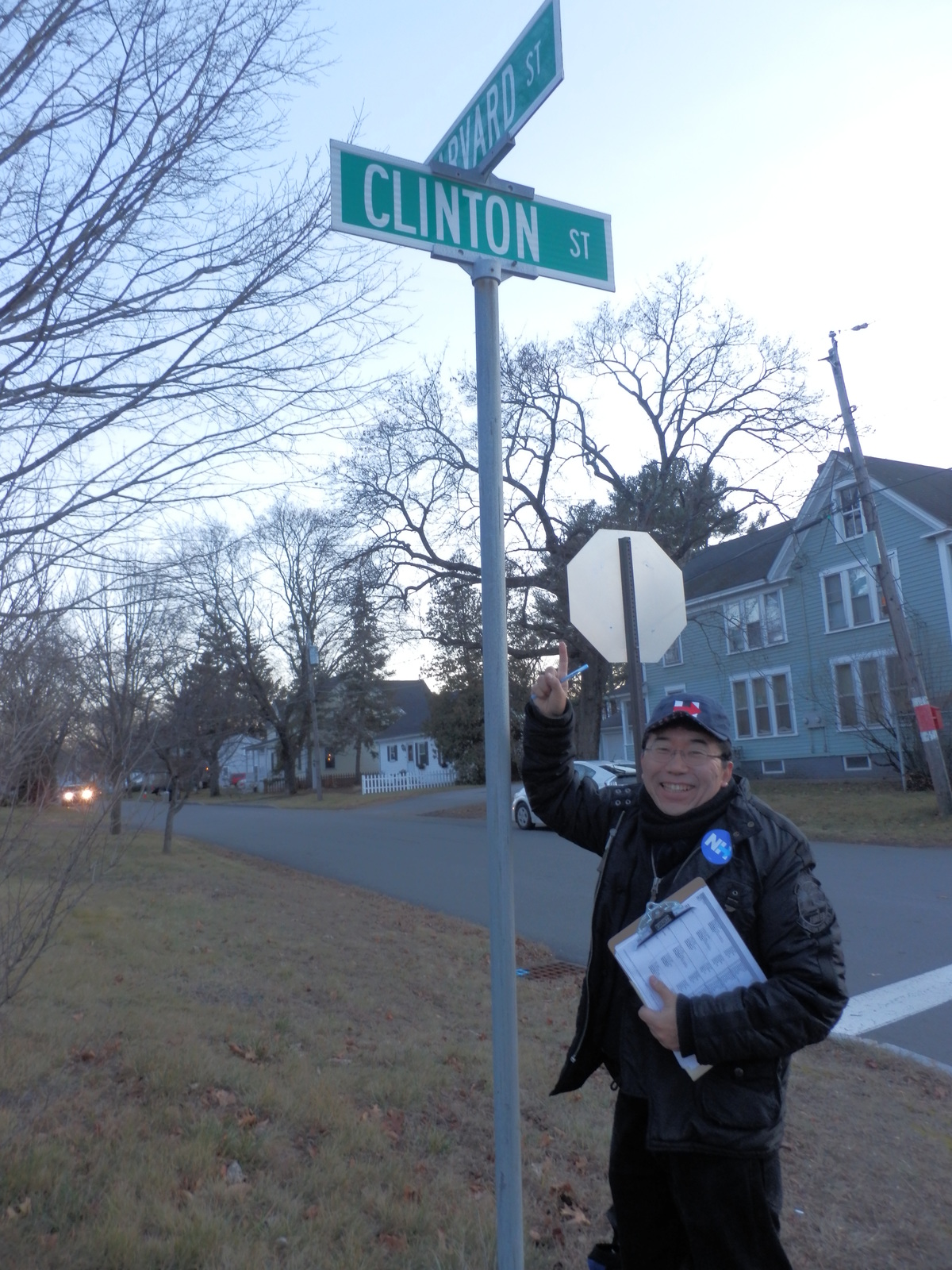 クリントンストリート 15年12月、戸別訪問の最中にクリントンストリートを見つけ指差す筆者(@ニューハンプシャー州コンコード)