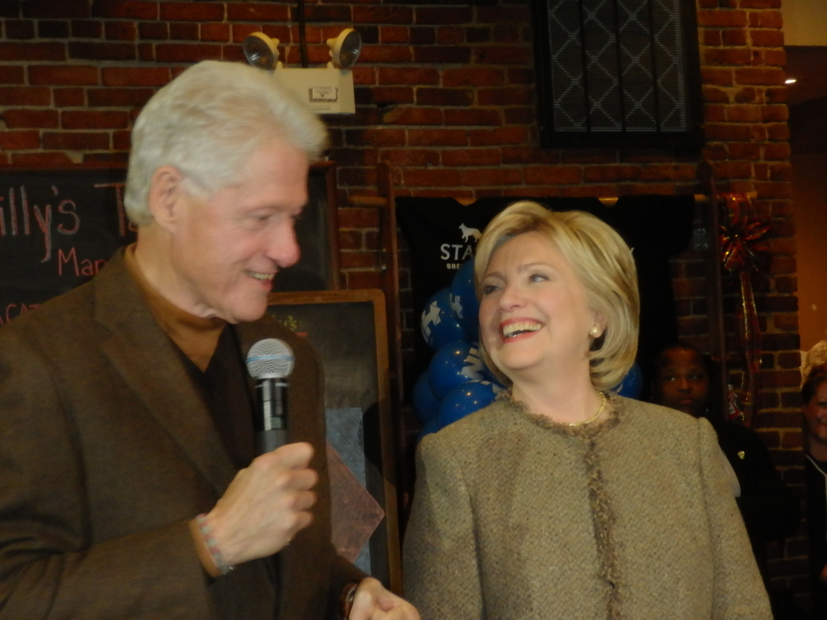 第3回民主党テレビ討論会終了後、ディベート・ウォッチに参加した支持者に感謝の意を述べるビル・クリントン元大統領とヒラリー・クリントン候補。同候補は夫のクリントン元大統領を「秘密兵器」として紹介した(筆者撮影@ニューハンプシャー州マンチェスター「ミリーズ・タバーン」)
