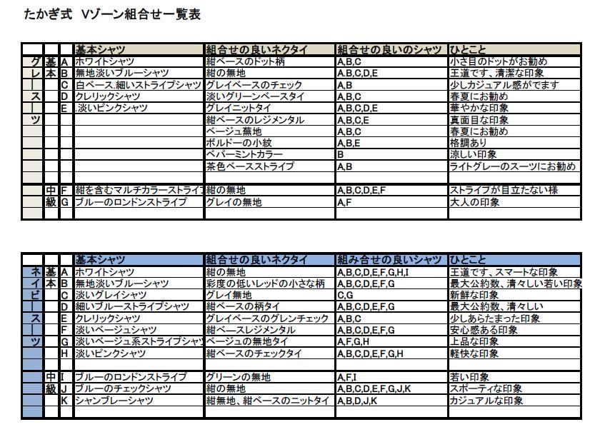 具体的な例とすればスーツが1着でもシャツが2枚でネクタイが2本あれば4スタイルが組めます。最小限で最大の効果が可能です。一見、見にくい表ですが時刻表で旅を楽しむのに似た疑似体験が楽しめます。読者の方のお手持ちのスーツ・シャツ・ネクタイでチェック頂ければ無駄な買い物はなくなること請け合いです。原理原則に沿えば無駄な買い物は必要ありません。おまけに横の欄には各シャツとネクタイの組合せの印象も加えています。例えば上品な印象を与えたい時はネイビースーツに淡いベージュ系のストライプシャツ・ベージュの無地タイをそのまま選べば安心です。これでS(サイズとシルエット)が合っていれば相手が外国の大統領でも怖くありません。