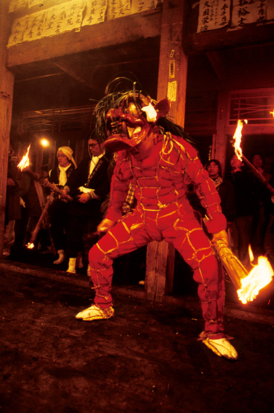 国東に古来から伝わる奇祭の1つ、旧正月の7日に行われる天念寺の修正鬼会。小松明を振り回して暴れ、里人に加持する赤鬼