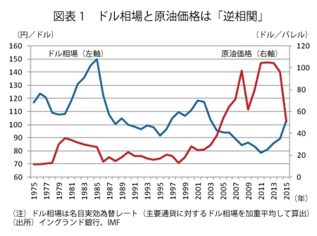 この点を少し敷衍しよう。年初から原油価格は一段と下落し、市場は冷え込んで急激な円高が起こりかねない局面にあった。そもそも、ドルは原油価格と逆相関的で、今回の大幅な原油安では急激なドル高が同時に生じている(図表1)。ところが、主要通貨の中で円だけドル以上に切り上がっている(図表2)。もちろん、急激な円高となれば、輸出や企業の海外売上にも悪影響を与えて景気が強く下押されるのみならず、大幅な原油安と相まってデフレも再度深刻化しかねない。