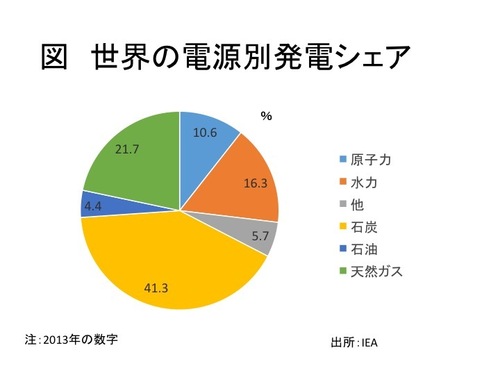 2013年の世界の電力消費量は石油換算で16億7700万トンだった。その発電の内訳は図の通りであり、石炭を中心に化石燃料が67.4%を占めている。
