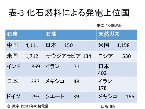 石油を利用する火力の発電シェアは減少しているが、世界で最も多く石油による発電を行っている国は日本、天然ガスによる発電1位は米国だ。表-3の通り、化石燃料による発電上位5カ国には全て原発停止の影響を受けた日本がランクインしている。この火力発電からの発電量を今後抑制することが必要とされる。
