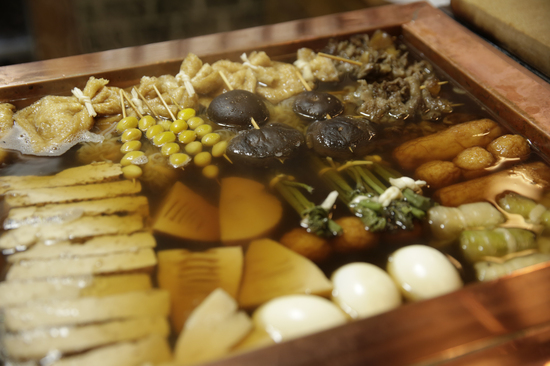 昭和8年創業の、おでんの専門店。昭和の間は料理屋として、他の物も出していたが、平成元年から献立を、おでんに限った。タコ、焼き豆腐、わかめ、牛すじ、春菊、ワラビ、ぎんなん、しゅうまい、ロールキャベツ、湯葉……。30種類近くある種の中、春はそら豆、夏はオクラ、冬は貝と牡蠣が仲間入り。朝の仕込みは、ダシとりと、コンニャクしきから始まる。長年大事に守るダシは、かつおと昆布、少しの鶏ガラで丁寧に。だいこんは沸騰させず、ことこと炊いて味をつける。時間はかかるが優しい味に仕上がるという。こちらのおでん食べたさに、わざわざ東京や九州から新幹線に乗って、姫路までやってくる常連もいる。