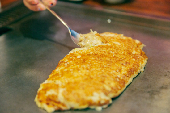 昭和61年創業「喃風」(なんぷう)の、どろ焼き。たこ焼きのどろどろとした生地を鉄板に流し、具材を入れてふわふわと、オムレツのような形に仕上げる。和風だしにつけて味わい、後味はあっさり。お好み焼きや焼きそばなど、こってりとしたソース味の鉄板焼きが当たり前の姫路で評判を呼び、姫路名物と言われるように