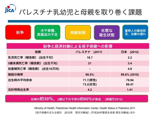 パレスチナでは、医療従事者が母親への保健指導に、また、自宅での夫婦間で出産や子育てについての話し合いなどにも、母子手帳が活用されるようになった(※出所)。妊娠中の危険な兆候に対し、母親自身が気づき、迅速に医療機関を受診できるようになった。妊娠出産、乳児の緊急事態に備え、夫の役割がより明確に理解されるようにもなった。