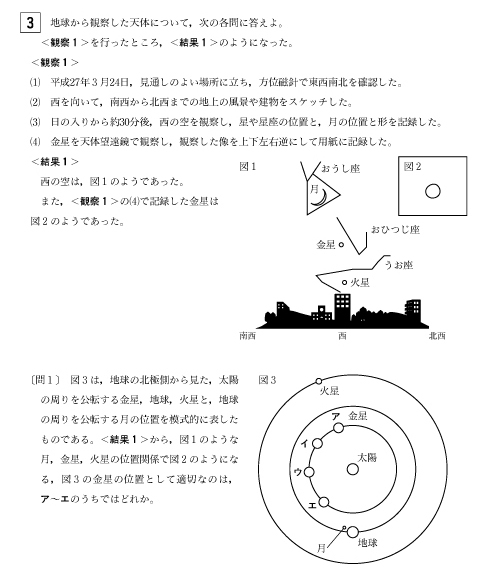 この問題は、図1、図2の情報を元に、金星が図3のア~エのどの位置にあるかを答える問題である。考えてみよう。