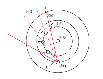 まず、図1から、西の空に見えている金星の位置は、火星と月の間のちょうど中間のやや火星寄りだ。これは、図3において、金星がイとウのどちらに位置しているときの見え方だろうか。