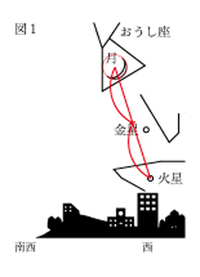 これを見ると、ウの位置に金星があるときに、ほぼ、月と火星の中間地点に金星が見えることがわかる。もし、イの位置に金星があったとすると、図1の西の空の図においては、金星はそこに書かれている場所よりも、かなり火星に近い場所(図1で書かれている金星の位置と火星の位置の中間地点、もしくはさらに火星に近い側)に見えているはずであると考えられる。