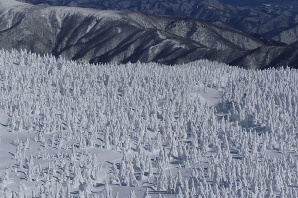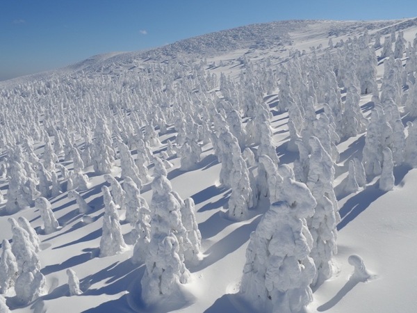 空から樹氷群を見渡すと蔵王連峰であっても、樹氷ができている地区は一部分であることがわかる。限られた条件によって形成される奇跡的に稀な現象なのだ。