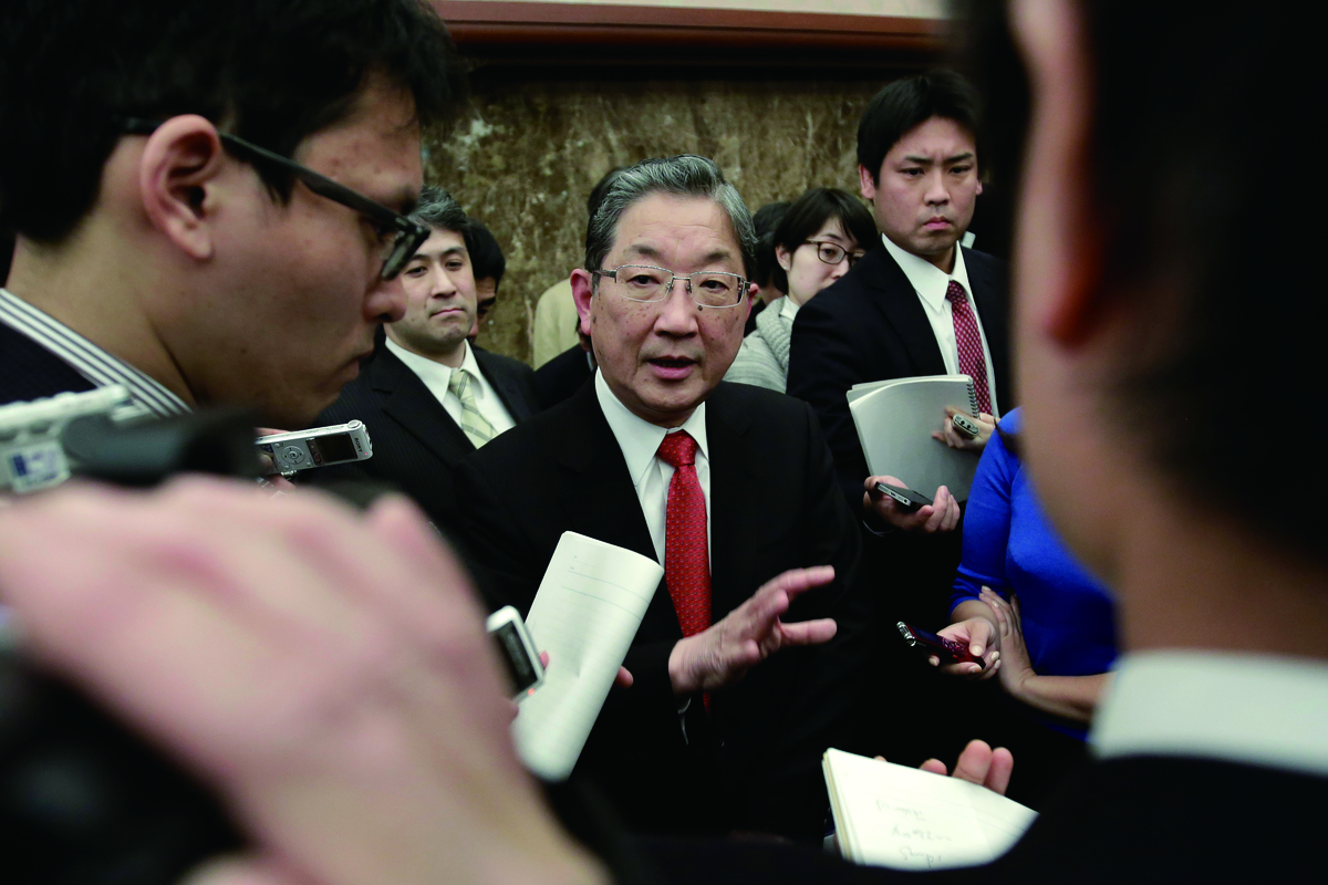 シャープ支援策について記者会見する志賀俊之・産業革新機構会長兼CEO(JIJI)