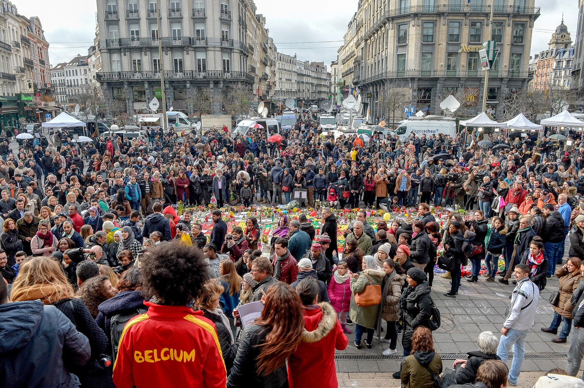 テロの犠牲者を悼んでブリュセル市内の広場に集まった人々(Getty Images)