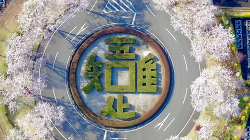 並木の中央部には円形のロータリーがあり、その内側が植え込みとなっている。そこには写真のように「吾唯足知」と刈り込まれた文字がある。これは、仏教ではお釈迦様の言葉として有名で「われはただ足を知る」と読む。「人は欲張らずに今の自分を大切にしなさい」という教え、とのことだ。この植え込みは前述の高台からもはっきりとは見えない。この文字を認識している人は来園者でも少ないのではないだろうか。今回の撮影によってこの文字も上空から捉えることができた。