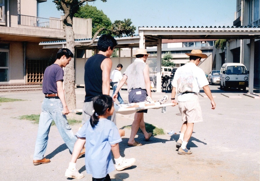 秋津コミュニティで毎年実施の防災被災訓練を兼ねた一泊キャンプで、学校に設置の防災倉庫に常備する簡易担架に子どもを乗せての避難訓練の様子