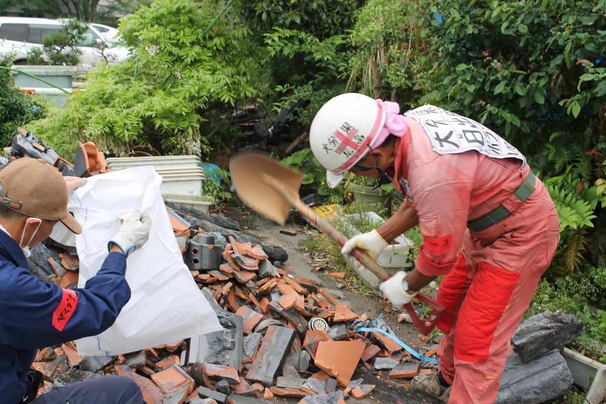 取材班は10人1班の瓦礫撤去作業に密着した。班長が注意事項の伝達を終えかけたとき、円陣の後ろにいたメンバーの1人が強い口調で声を上げた。「ボランティアは自己責任であることを忘れないこと。鉄や釘でけがをすると破傷風になるので気をつけるように」。