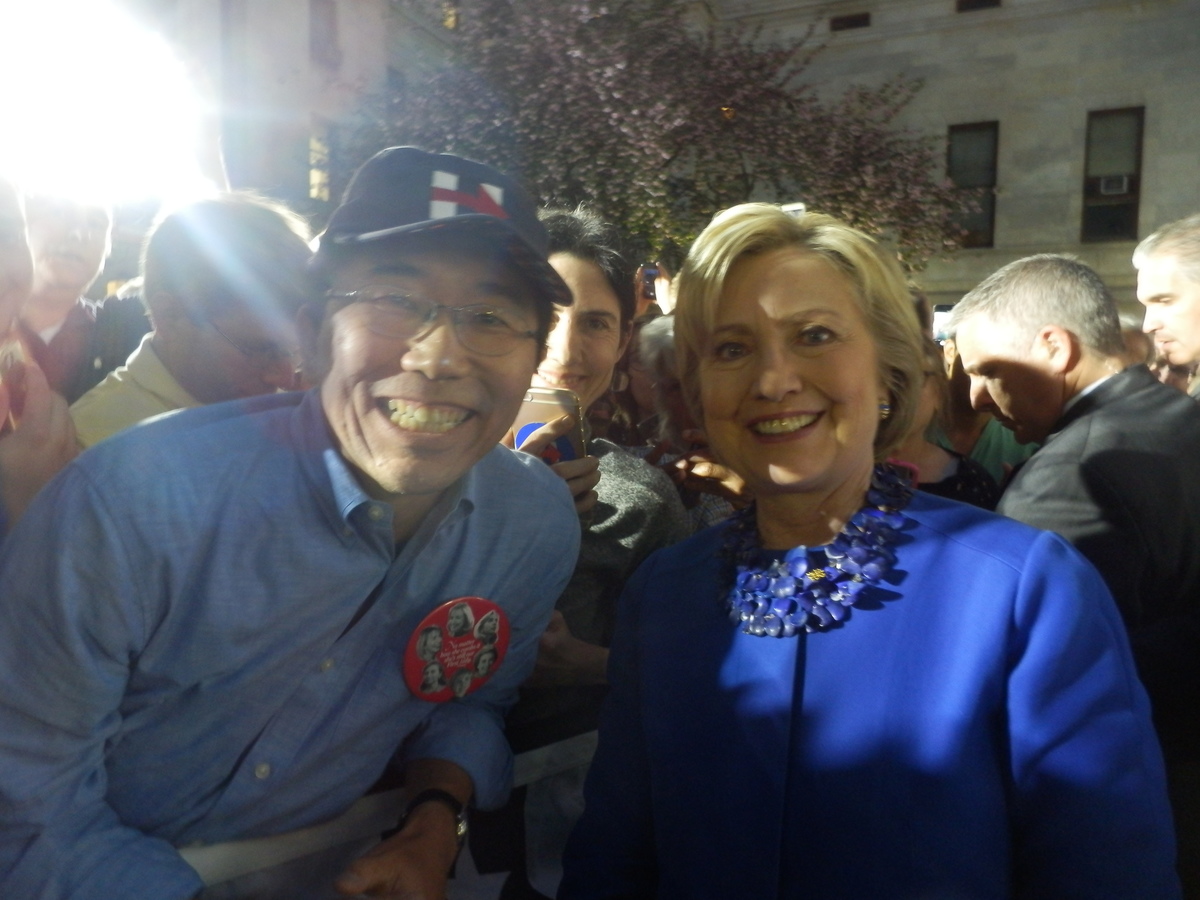 ペンシルベニア州予備選挙投票日前日のクリントン候補と筆者(@ペンシルベニア州フィラデルフィア市役所)