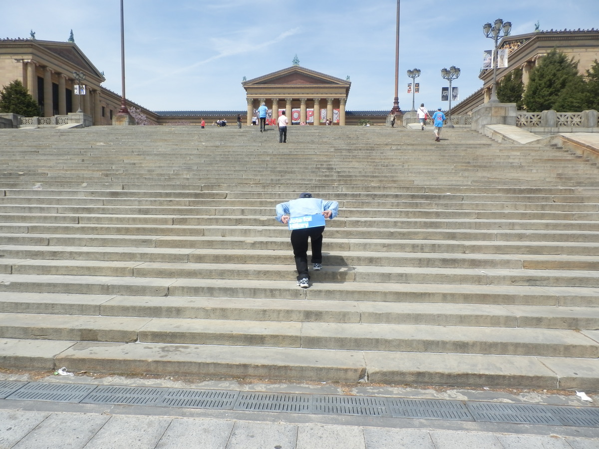 クリントン支持の看板を持ってロッキー・ステップを駆け上がる筆者(@ペンシルベニア州フィラデルフィア美術館)