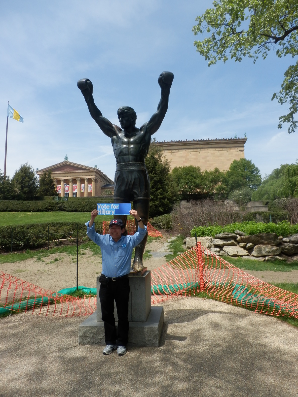 ロッキー銅像の前でクリントン支持の看板を掲げる筆者(@ペンシルベニア州フィラデルフィア美術館)