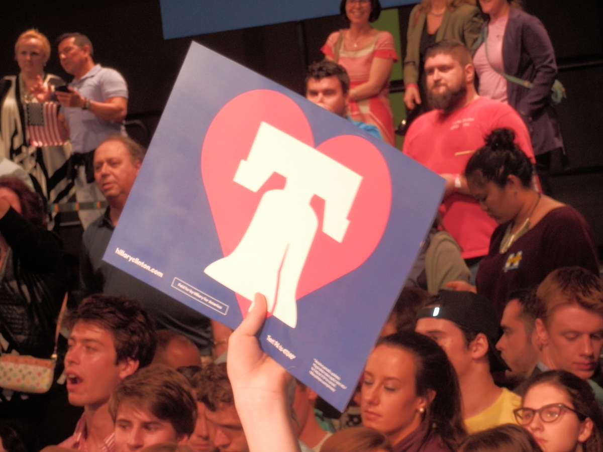 「自由の鐘」の看板(筆者撮影@クリントン勝利集会-ペンシルベニア州フィラデルフィアコンベンションセンター)