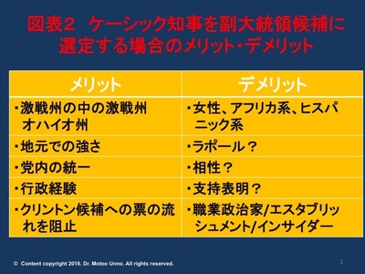 トランプ候補は、上で挙げた候補の中でケーシックオハイオ州知事を高く評価しています。そこで、ケーシック知事を副大統領候補に選定した場合のメリットとデメリットについて整理してみます(図表2)。