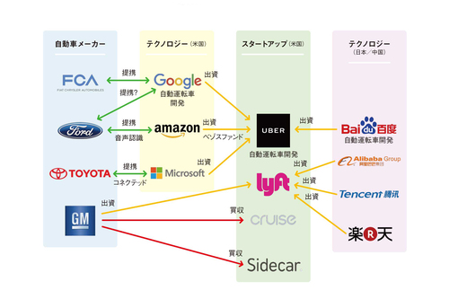 自動車メーカーがこうして動き出す以前から、Googleをはじめとするテクノロジー系企業は投資、パートナーシップに積極的に動いていた。Googleは、Uberにとっての初期(13年)の大きな投資家であり、Google Mapsとの連携、ボルボ、フォード、Lyftなどと共同での自動運転推進団体の設立、など活発に動き始めている。マイクロソフトやアマゾンなどもUberに投資を行っている。