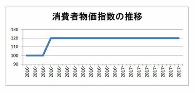 ある時「石油ショック」が発生して原油価格が高騰し、そのまま推移したとします。ある国では原油価格の高騰を受けて、消費者物価指数が100から120に上がり、そのまま推移したとします。なお、この国の消費者物価指数には季節性は無いとします。