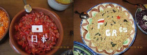 (左)サラダの上にチーズで「日の丸」「日本」をつくり、ニッポンのオジサンを歓迎(右)パエーリャ風のご飯の上にチーズでつくった「赤白の巡礼道進行方向のサイン」「巡礼道路番号GR65」を飾り、ゲストを歓迎