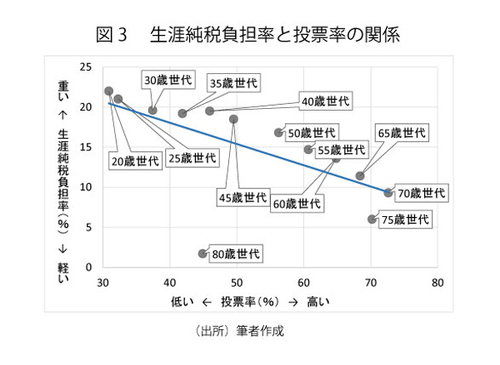 図3は、世代別の生涯純税負担率と第47回衆議院議員総選挙における年代別投票率の関係を見たものである。図3からは、世代別投票率と世代別の生涯純税負担率との間には負の相関関係があることを確認できる。つまり、この図は投票に行かない若者世代が投票によく行く高齢世代から負担を押し付けられている、つまりツケ回しされている構図を雄弁に物語っている。