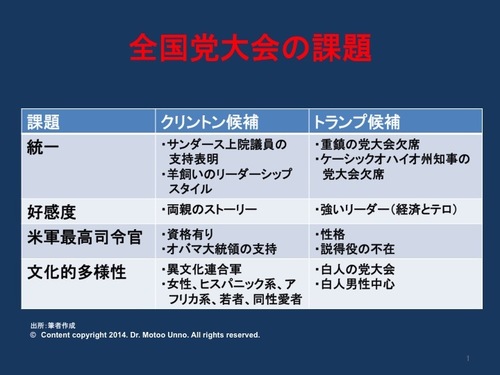そのような状況で、トランプ候補は党内の結束を図れるのかが課題になっています。率直に言いますと、党内の統一はかなり困難です。仮に、カリフォルニア州サンノゼで発生した以上の大規模の抗議運動がクリーブランドで起きますと、共和党のイメージ低下は回避できません。