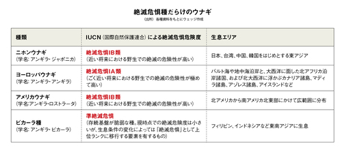 ウナギの問題は密漁や密輸入といった違法行為だけではない。日本人はこれまで世界のウナギを食い尽くしてきた。日本や台湾、中国、韓国など東アジアに生息しているニホンウナギは14年にIUCN(国際自然保護連合)によって、「近い将来における野生での絶滅の危険性が高い」とされる絶滅危惧IB類に指定された。