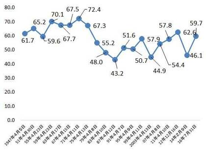 今回の都知事選の投票率は59.73%となり、投票日前日に東京都心では20年振りとなる大雪に見舞われた2014年2月の前回都知事選の投票率46.14%を13.59%ポイント上回る大幅な上昇となった。