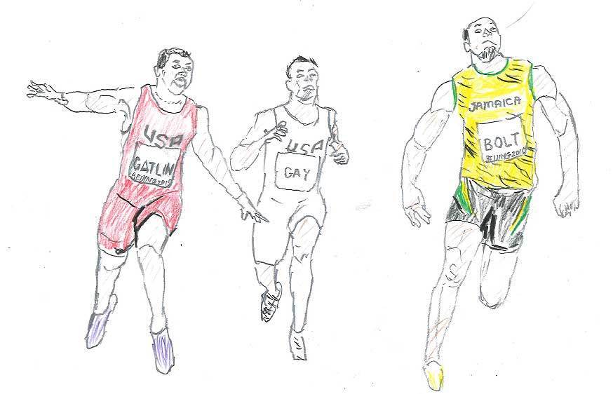 図1 昨年の世界陸上北京大会で、100分の1秒差で勝敗を分けたボルトとガトリンのゴール時のスケッチ。五輪でもこの再現になるか。