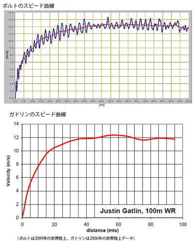 ボルトの走りは、スタートはガトリンに遅れるが、50m時点で秒速12m、70m手前でトップスピードの12.35m(時速44.46km)に達し、その後12mを下回ることはない。一方、ガトリンのスタートダッシュは圧巻。60m手前でトップスピードはボルトと同じ秒速12.35mに達する。ローからトップに入るギアチェンジの速さが特徴だ。ちなみに、日本人最高記録の桐生のトップスピードは11.65m。この数字は決して悪いものではなく、過去に9秒台を出した選手よりトップスピードは早い。桐生に日本人初の9秒台の期待が高まるのもこの数字があるからだ。