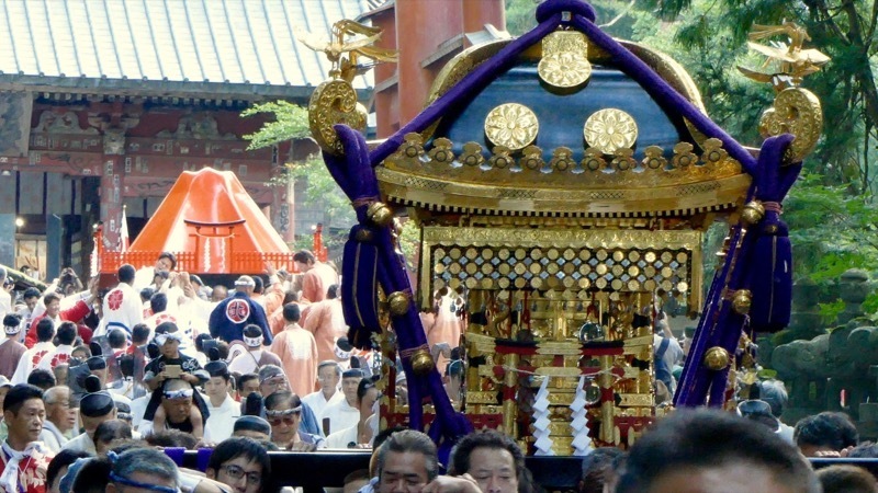 当日の朝、北口本宮冨士浅間神社にて準備されるのは二つのお神輿である。一つは屋根に鳳凰が置かれ、きらびやかな装飾が施された「明神神輿」。もう一つは赤富士をかたどった「御山神輿」である。「御山神輿」は、一見すると神輿には見えない形状であるが、通称「おやまさん」と呼ばれ、この祭には欠かすことのできない存在である。