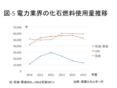 2010年に1100万キロリットル(KL)だった電力会社の原油と重油の消費量は、2011年には2300万KLを超え、2012年には3000万KLに迫った。2010年に4200万トンだったLNGの消費量は、2011年には5300万トン、12年には5600万トンに達する。2013年から原油・重油の消費量は減少を始めるが、代わって石炭が1000万トン増加する。図‐5が示す通りだ。