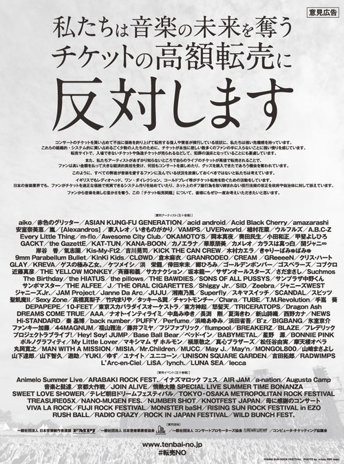8月23日付けの読売新聞と朝日新聞に「私たちは音楽の未来を奪うチケットの高額転売に反対します」という意見広告が全15段で掲載された。広告を出したのは日本音楽制作者連盟、コンサートプロモーターズ協会(以下、ACPC)など4つの音楽関係団体。賛同者として人気アイドルグループの嵐やサザンオールスターズなど116組の著名アーティストが名を連ねた。